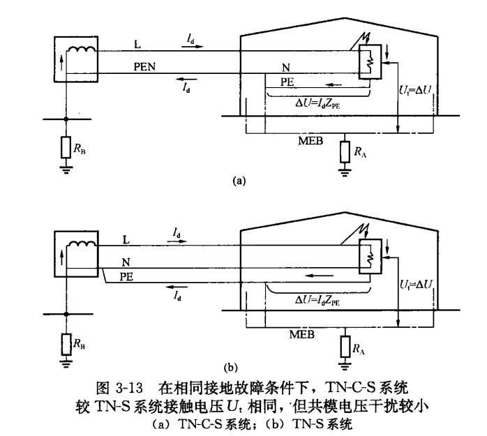 由于TN-C-S系統的中性線和PE線在進入建筑物之后才分開的,與TN-S系統相比較,它們之間的電位差較小,對信息技術設備引起共模干擾的可能性較小,這正是一些發達國家對低壓供電的建筑物更多采用TN-C-S系統的一個重要原因。如下圖所示,在都作有總等電聯結(MEB)條件下,發生相同接地故障時,兩者的接觸電壓都是Ut=IdZpe。而TN-C-S系統分開的中性線較短,共模干擾自然較小。
