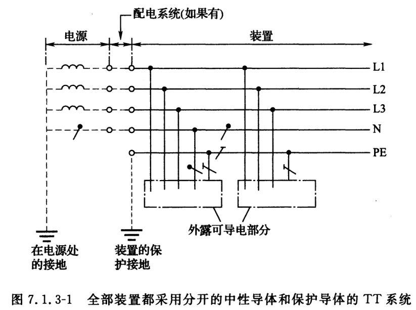 所有帶電部分應與地隔離,或某一點通過阻抗接地。電氣設置的外露可導電部分,應被單獨地或集中地接地,也可接到系統的接地上。對裝置的PE可另外增設接地,并應符合下列要求: