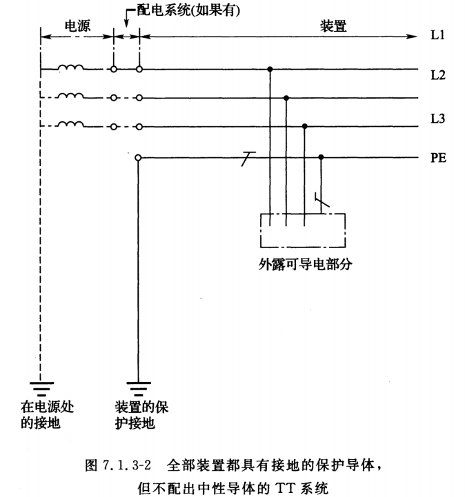 只有一點直接接地,裝置的外露導電部分應連接在電氣上獨立于電源系統接地的接地極上。對裝置的PE可另外增設接地。