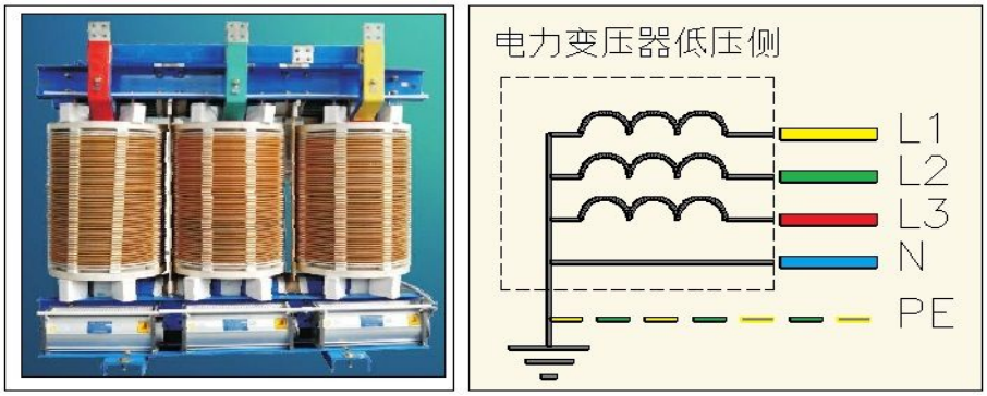 電力變壓器內部接線實物圖如圖三左圖。黃色、綠色、紅色和藍色四組鍍錫銅排,分別是L1、L2、L3三相繞組和中性線N。右圖的接線圖是低壓配電網的線制。線制中的三相就是變壓器的三相繞組,線制中的“線”指的是正常運行時有電流流過的線路。三相繞組在正常運行時有電流流過,因此三相繞組所在線路符合“線”的規定;中性線在正常運行時也有三相不平衡電流流過,因此中性線N也符合“線”的規定;地線PE在正常運行時是沒有電流流過的,因此它不屬于“線”,所以,圖示這種線制叫做三相四線制,不叫三相五線制。
