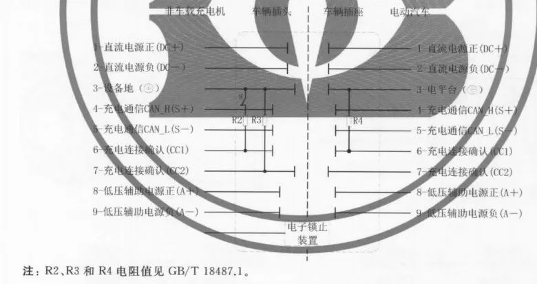 9孔槍頭的9個信號的定義見《GB/T 20234.3-2015,電動汽車傳導式充電用連接裝置 第3部分:直流充電接口》,如圖2示意。