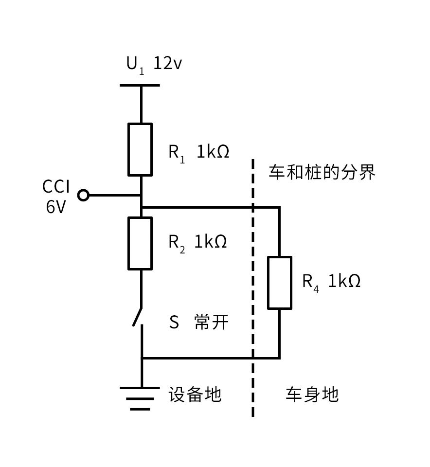 如圖8所示,U1是經過R1和車上的R4、車身地。車身地和設備地連接在一起。S開關是常開狀態。CC檢測點的等效電路的簡化如圖9所示,易算出CC1電平為6V。