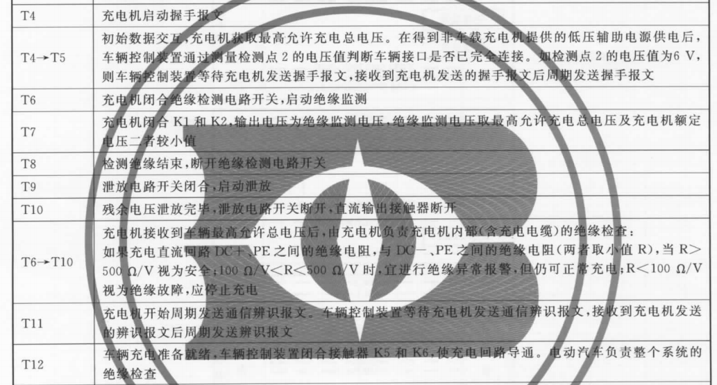 充電握手階段是充電流程中比較復雜的部分,也是售后問題比較集中的階段。在18487.1附錄B的表B.2中,時序上包括T4-T11,如圖1所示。( 這個表格中,T11是屬于充電握手階段還是充電參數配置階段?在充電握手階段充電樁和車輛之間要互發辨識報文,緊接著進入充電參數配置階段時首先要互發電池參數和充電機最大輸出能力等報文,然后再閉合K5、K6。T11和T12都沒提到要互發電池參數和充電機最大輸出能力等報文。)
